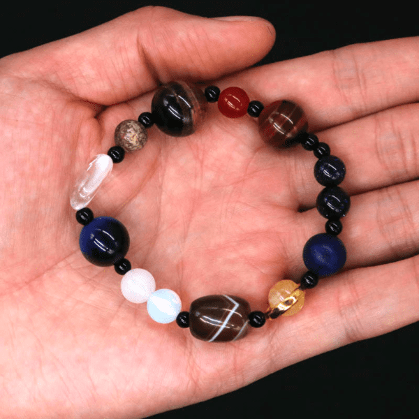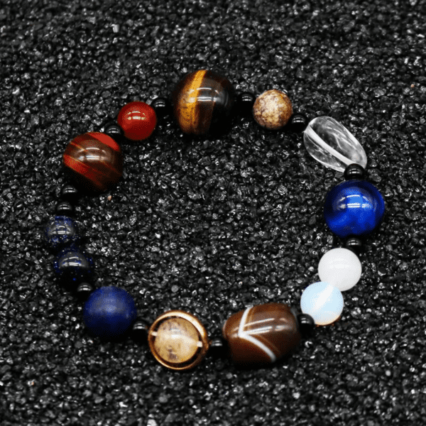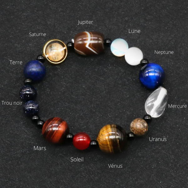 Décorez votre poignet avec ce Bracelet Pierre Système Solaire composé de perles naturelles, assemblé à la main et ne faites plus qu’un avec l’univers.