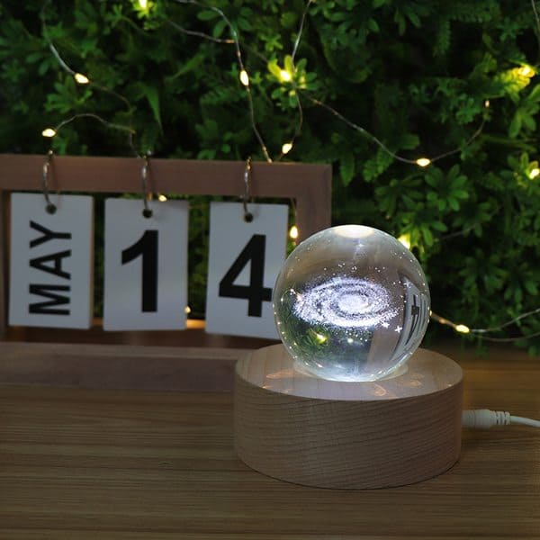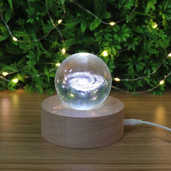 - L’offre comprend : une boule de cristal 3D + une lampe en bois + un câble USB