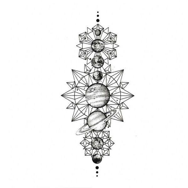 Occasion spéciale ou essai d’un nouveau motif ? Découvrez ce Tatouage Éphémère Système Solaire Géométrique et contemplez la beauté de nos Planètes.